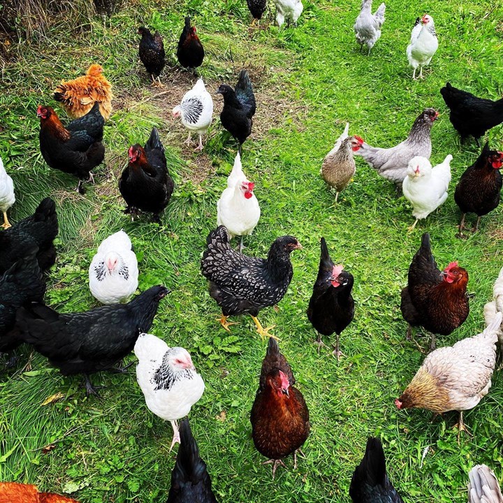 Hier leben 26 ausgewählte Rassen, die sich auf Gras, Maulwurfshügeln, Unkraut, Bäumen, Büschen und Beerensträuchern tummeln. Die Hühner sind eine Augenfreude und legen hübsche Eier in allen möglichen Farben, die schönes, cremigen Eigelb und festes Eiweiß haben. Auch das Fleisch ist von hoher Qualität.