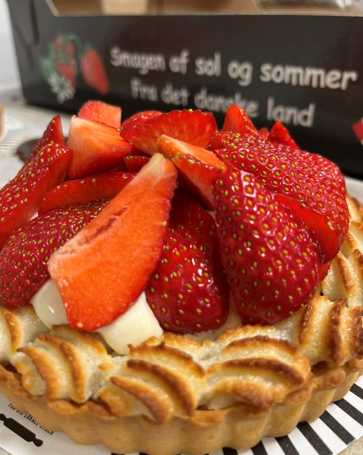 Cremen sprøjtes på tærtebunden, og den kan nu pyntes med lækre danske jordbær, eller anden frugt.