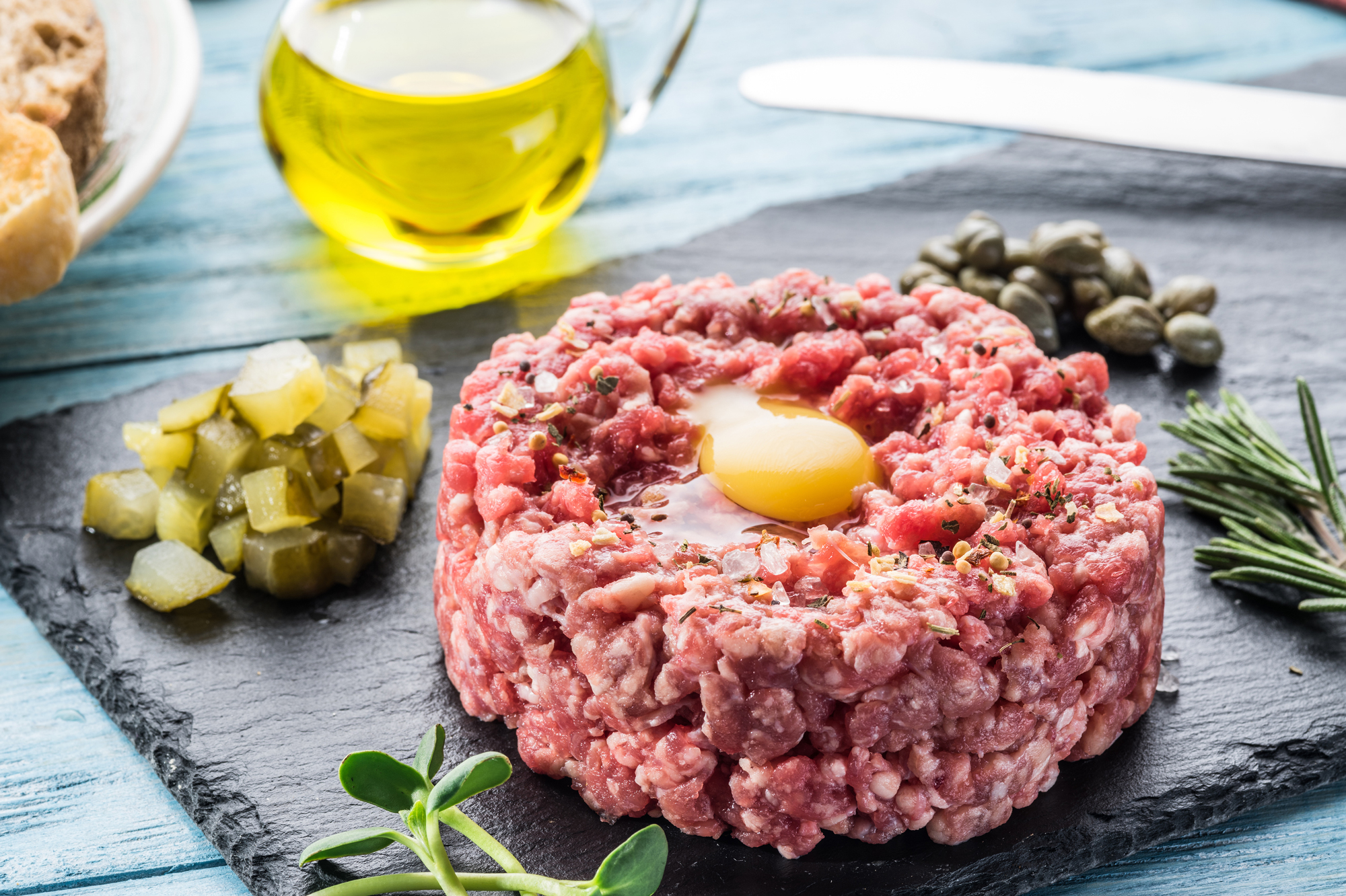 Tips: Rørt tatar med trøffelmayo serveres med friskbagt brød og salat, marineret i vinaigrette og valnøddeolie.
