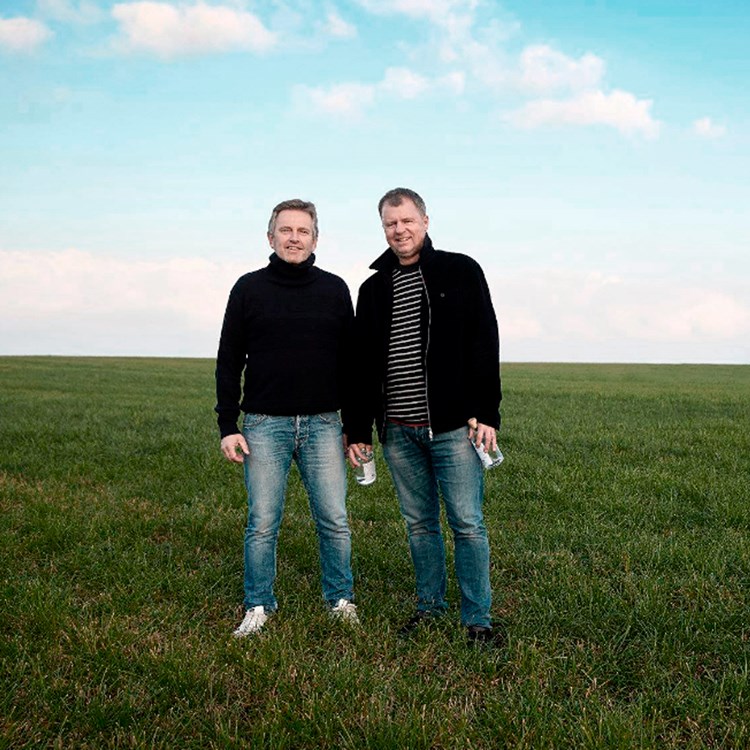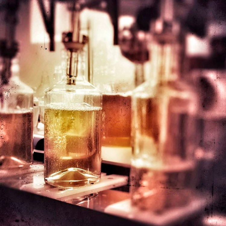 Kold snaps, hindbærbalsamico og sukkersirup blandes og hældes i et afkølet champagneglas